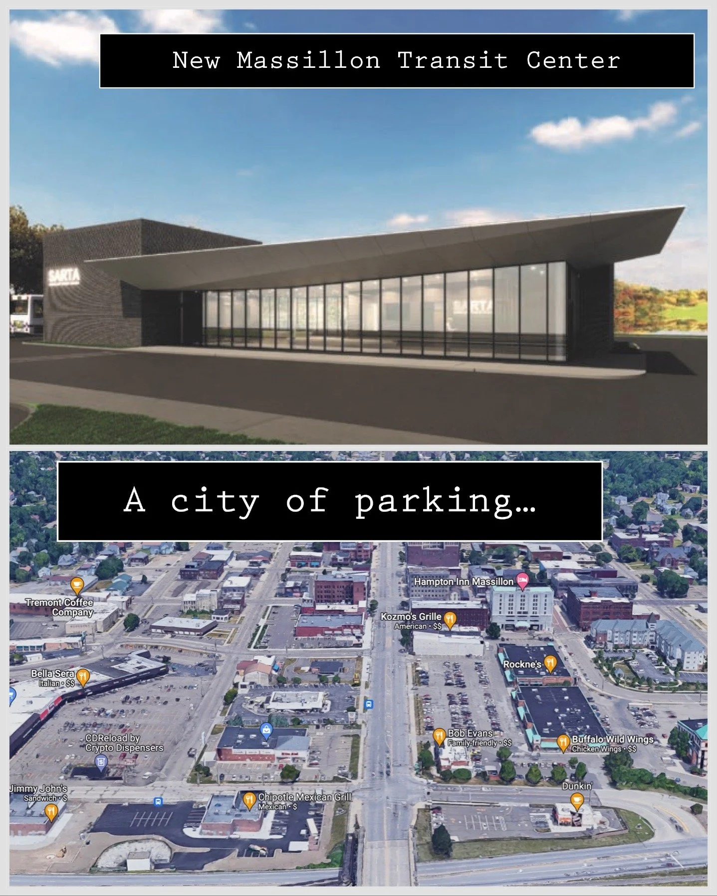 On a final note, Stark Area Regional Transit Authority (SARTA) is building a new $5,100,000 transit center. The 5,565 square foot building is practically downtown, but that didn’t stop them from putting a park-and-ride on this baby. Along with 20 additional parking spaces in a downtown that is almost one giant parking lot; EV charging stations will also be available. The gold standard of downtown park-n-rides has been born and its creator's name is Massillon, Ohio. Honestly, I really didn’t realize how much potential is being squandered until I looked at the stone cold facts.